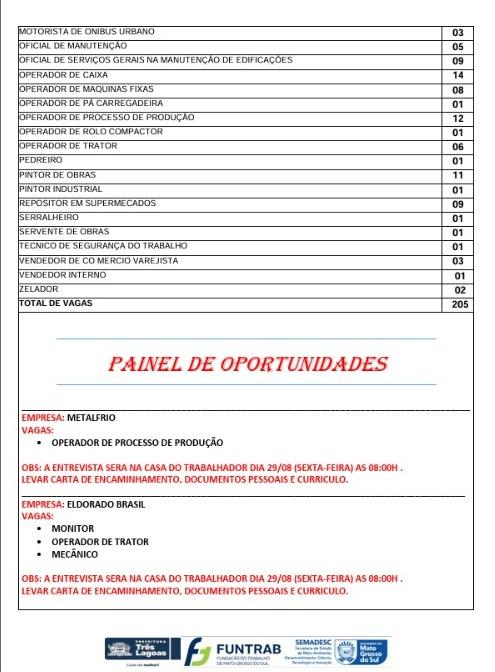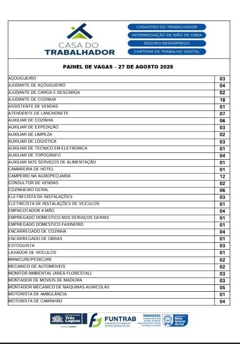 Você está em busca de uma nova oportunidade no mercado de trabalho? Então fique ligado nas vagas disponíveis na Casa do Trabalhador de Três Lagoas, onde a Prefeitura Municipal, em parceria com a Fundação do Trabalho de Mato Grosso do Sul (Funtrab), oferece, nesta quarta-feira (27), 205 oportunidades de trabalho para você!