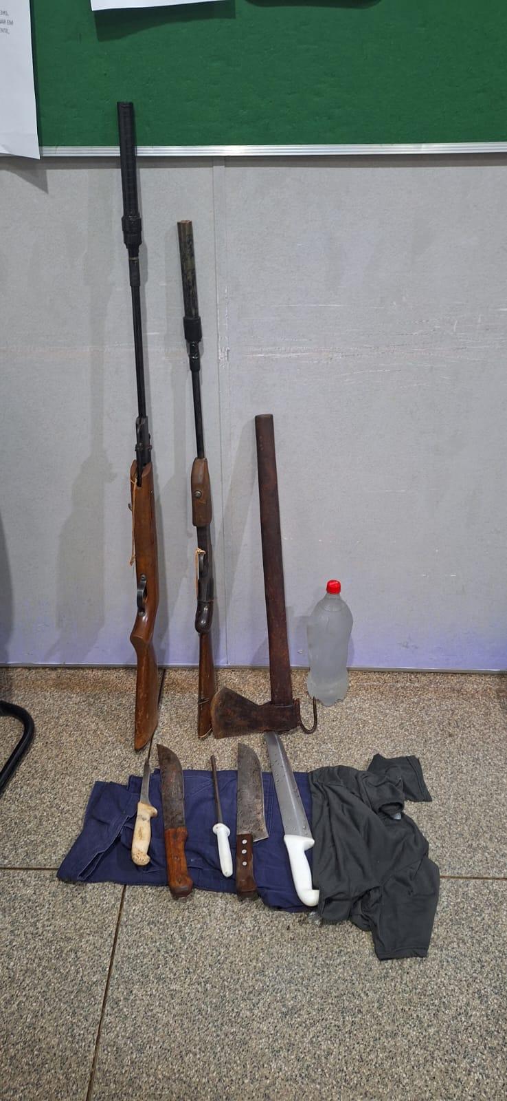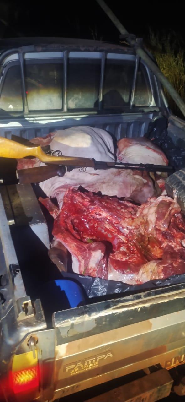 Dentro do carro foram localizadas duas espingardas, facas, uma chaira e um machado, usados para o abate do animal. O funcionário da Fazenda São José confirmou que os restos encontrados eram de um boi pertencente à propriedade.