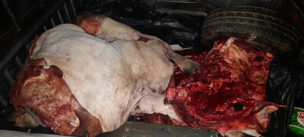 O caso teve início por volta das 5h30 da manhã, quando uma equipe policial que patrulhava a rodovia suspeitou de um veículo Ford Pampa carregado sob uma lona preta, típica em ações criminosas de transporte de carne furtada. Ao abordar o carro, os policiais encontraram a carroceria tomada por partes de um boi recém-abatido de forma ilegal.